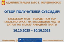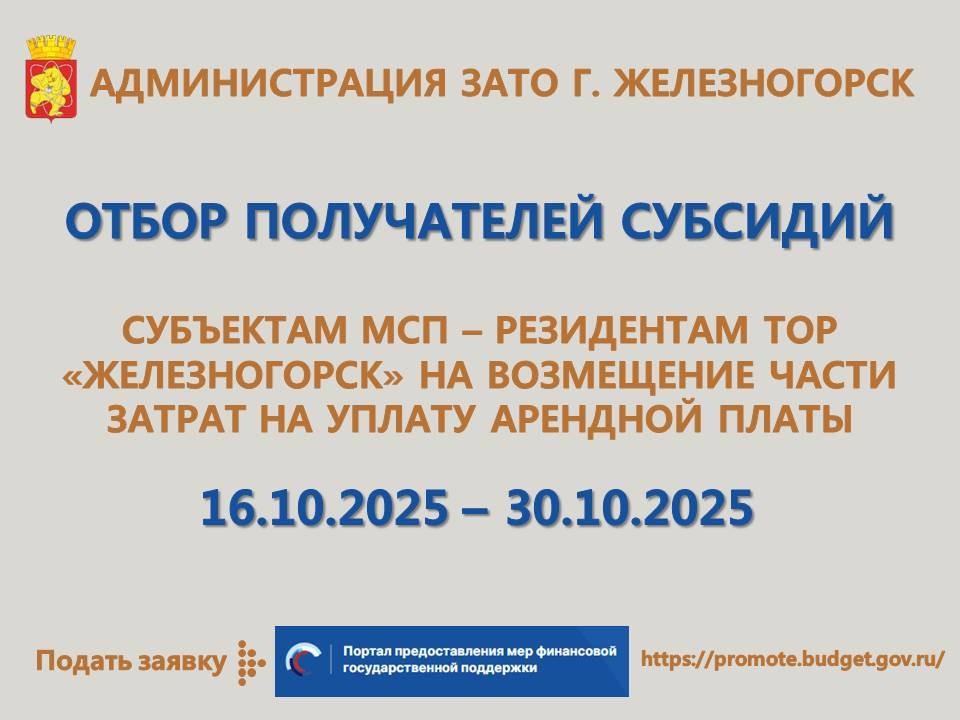 Администрация ЗАТО г. Железногорск объявляет о проведении отбора получателей субсидий для предоставления субсидий субъектам малого и среднего предпринимательства, являющимся резидентами ТОР «Железногорск», на возмещение части затрат на уплату арендной платы за земельные участки (объекты недвижимости), расположенные на ТОР «Железногорск».